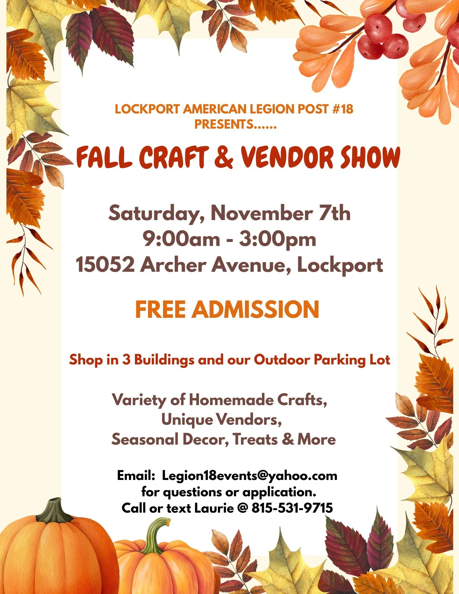 Back to All Events Lockport American Legion Post #18 Fall Craft Show Saturday, November 7, 2026 9:00āÆAM 3:00āÆPM Lockport American Legion Post #18 15052 Archer Avenue Lockport, IL, 60441 United States (map) Google Calendar ICS I am excited to be back at the American Legion Post#18 for the Fall Craft Show! Come see me and pick up some delicious toffee!!