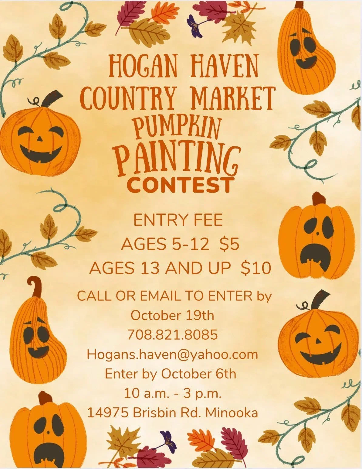 Back to All Events Hogan’s Haven Fall Festival Sunday, October 19, 2025 10:00 AM 3:00 PM Hogan's Haven 14975 Brisbin Road Minooka, IL, 60447 United States (map) Google Calendar ICS Come out to Hogan’s Haven Country Market for the annual Fall Pumpkin Festival!